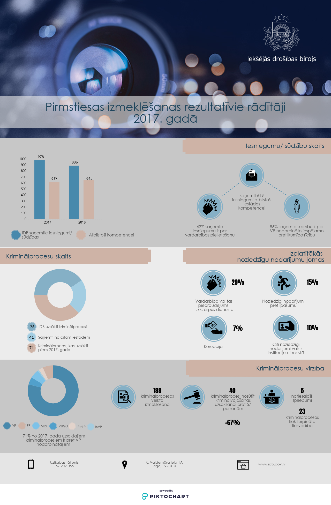 2017. gadā kopumā no lietvedībā esošajiem kriminālprocesiem 40 tika nosūtīti kriminālvajāšanas uzsākšanai pret 57 personām. 2017. gadā kriminālvajāšanas uzsākšanai nosūtīto kriminālprocesu skaits, salīdzinot ar 2016. gadu, ir pieaudzis par 67% – tas skaidrojams ar izmeklētā noziedzīgā nodarījuma specifiku, kas saistīta ar atšķirīgu laika resursu patērēšanu un nodarījuma pierādīšanas sarežģītību. Vienlaikus ir uzlabojusies gan iekšējā, gan ārējā sadarbība ar citām iestādēm, kā arī palielinājusies izmeklēšanas efektivitāte.